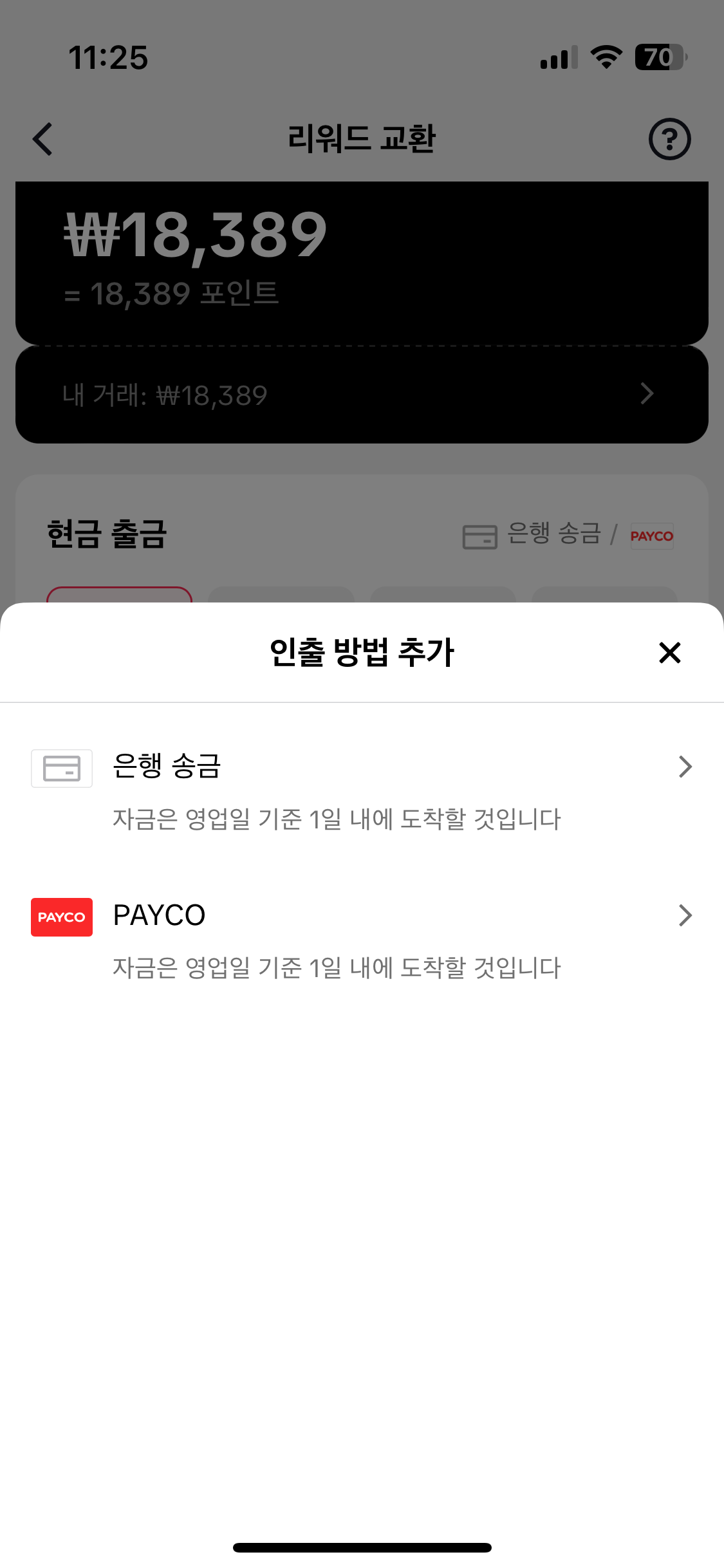 그럼 은행 계좌를 연결하거나 페이코로 받는 방법 중에 하나를 선택하라는 화면이 나옵니다. 여기서는 당연히 은행 송금을 눌러야 현금으로 받을 수 있겠죠?