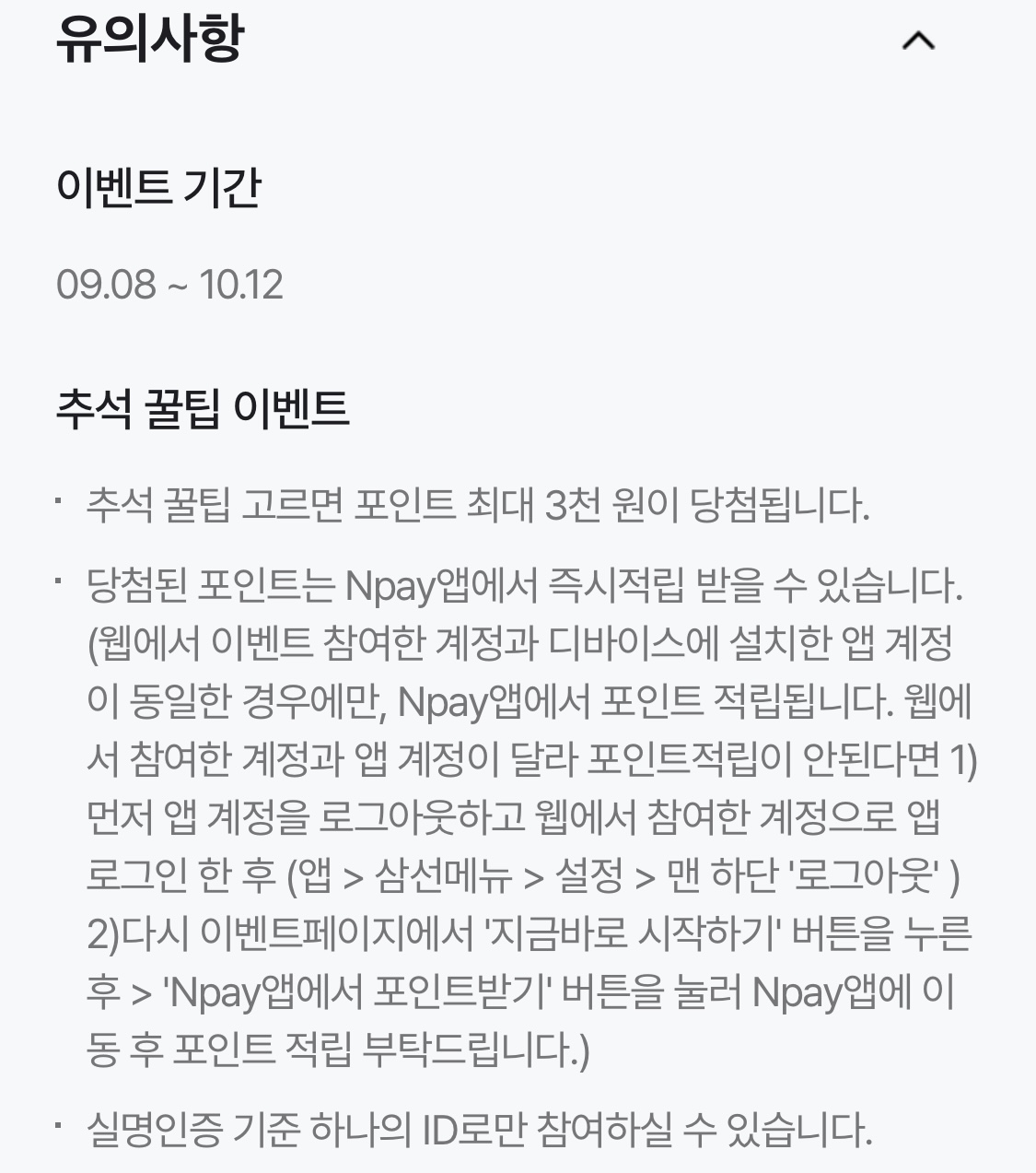 - 웹과 앱의 계정이 동일해야 합니다. 만약 웹에서 참여한 네이버 ID와 스마트폰의 네이버페이 앱에 로그인된 ID가 다를 경우 포인트가 적립되지 않을 수 있어요. 이 경우, NPay 앱을 로그아웃한 후 웹에서 참여한 ID로 다시 로그인하고 포인트를 받으시면 됩니다.